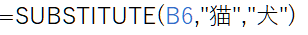 =SUBSTITUTE(“猫 犬 猫”,”猫”,”犬”) 犬 犬 犬