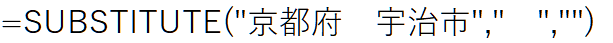 =SUBSTITUTE(“京都府 京都市 上京区”,” ”,””) 京都府京都市 上京区